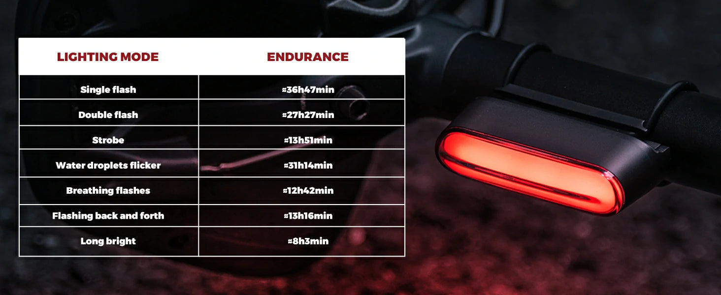 | Flash Modes | Single/Double flash, Flashing, Drip, Breathing, Back & forth, Constant on |